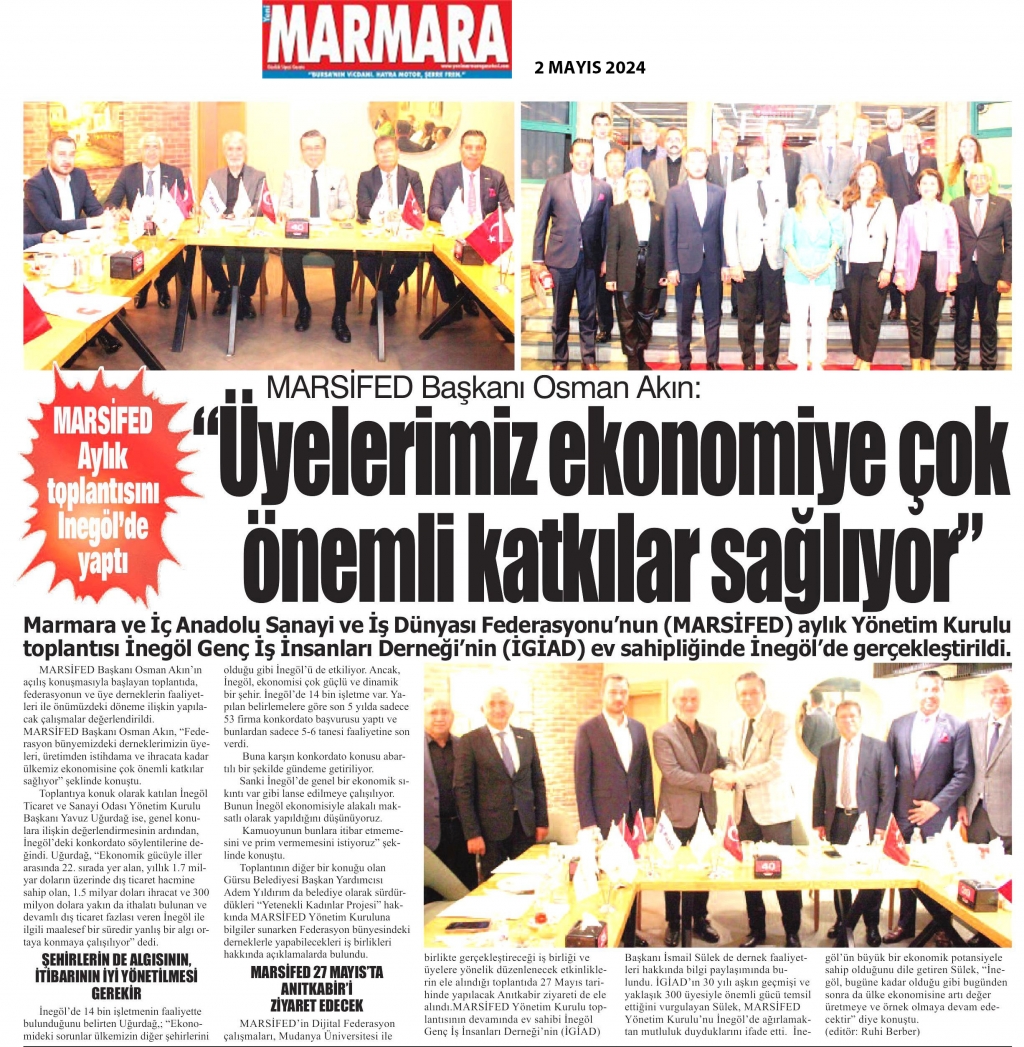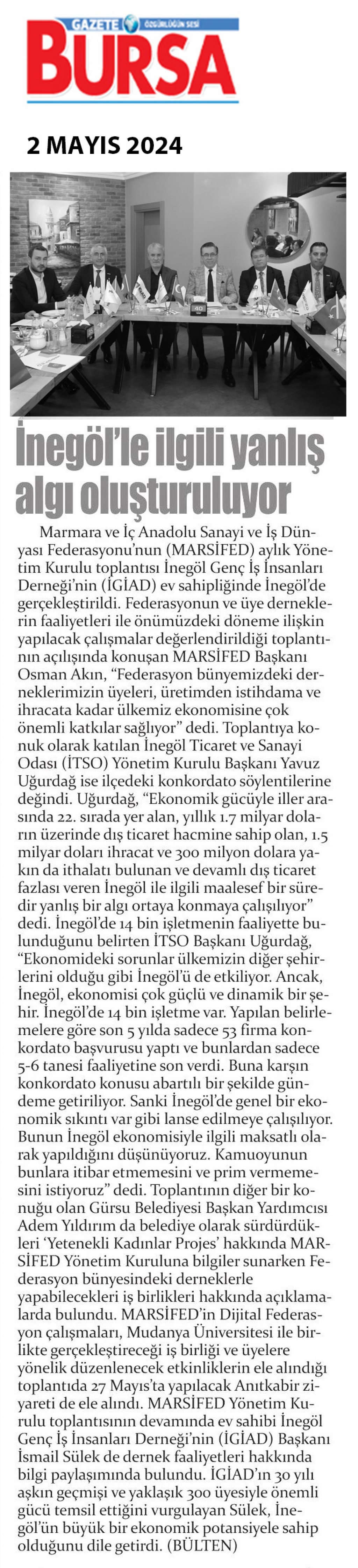 Marmara ve İç Anadolu Sanayi ve İş Dünyası Federasyonu’nun (MARSİFED) aylık Yönetim Kurulu toplantısı İnegöl Genç İş İnsanları Derneği’nin (İGİAD) ev sahipliğinde İnegöl’de gerçekleştirildi.